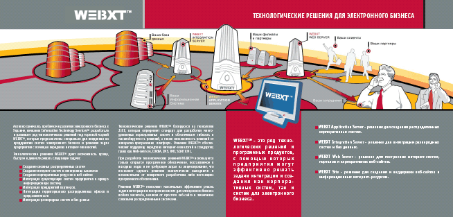 Буклет Information Technology Services™ 2003-2004 года Компания Information Technology Services™ выпустила новый буклет образца 2003 года, который детально описывает деятельность компании. Буклет состоитиз четырнадцати страниц и посвящен технологическим решениям WEBXT™ для электронного бизнеса, разработанным компанией для решения различных проблем предприятия.Эти решения актуальны как для огромных корпораций, так и для малого бизнеса Буклет построен таким образом, чтобы человек, открывший его, воспринимал информацию в виде разворотов , а не отдельных страниц. Для каждой страницы буклета была нарисована отдельная картинка, наглядно иллюстрирующая то, о чем говорится в данном разделе. Вместо плоских скучных схем, без которых было бы не обойтись в описании технологических решений, нарисованы яркие объемные рисунки, которые интересно разглядывать даже человеку далекому от информационных технологий. Обложка. |