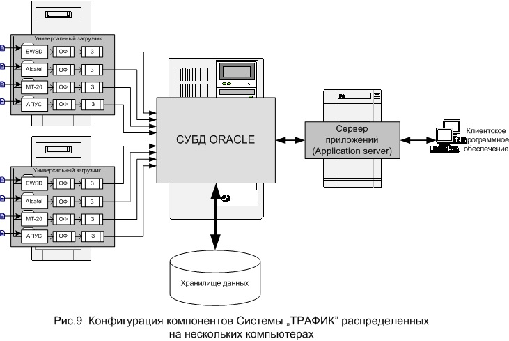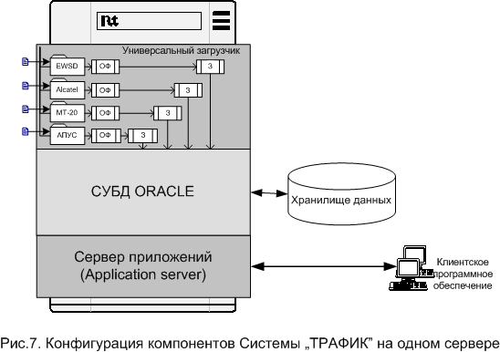 Система "ТРАФИК" состоит из компонентов и модулей, которые устанавливаются на аппаратное обеспечение (серверы, клиентские персональные компьютеры). Функционирование Системы "ТРАФИК" возможно в разных конфигурациях аппаратного обеспечения. Компоненты Системы "ТРАФИК" могут устанавливаться как на одном аппаратном сервере, так и могут быть разнесены на несколько серверов с разными вариантами установленных компонентов на каждом из серверов. Примеры разных конфигураций Системы "ТРАФИК" приведены на Рис.7. - Рис.9. Компонентная архитектура Системы "ТРАФИК" позволяет: -
