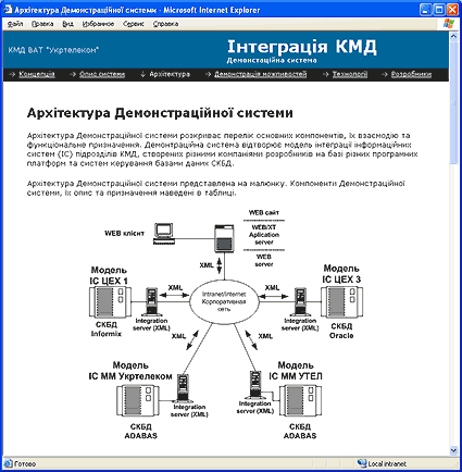 Демо-система "Интеграция КГД"Демонстрационная система создана специалистами Information Technology Services с целью демонстрации концепции, базовых принципов и технических решений для создания на базе Internet/Intranet технологий единой централизовано-распределенной информационной системы КГД ОАО “Укртелеком” для интеграции корпоративных ресурсов и информационных систем подразделений КГД.
