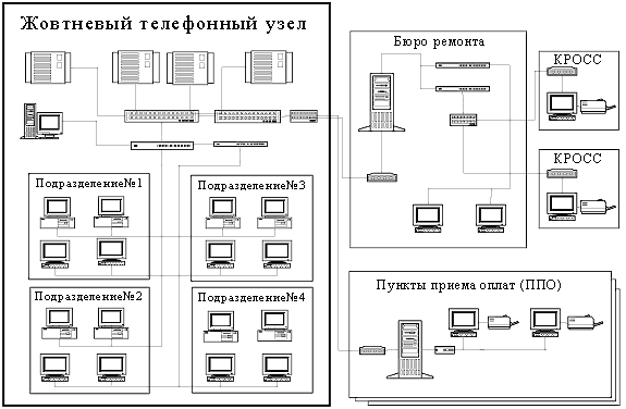 Все рабочие места распределенные по подразделениям, работают с базой данных АБР которая является частью единой распределенной базы данных предприятия. АБР включает в себя несколько служб: "АС АБР" поддерживает деятельность следующих подразделений предприятия электросвязи: - операторы по приему заявок от абонентов