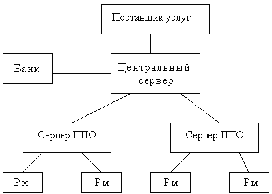 Архитектура и особенности системы.Общая архитектура системы ППО представлена на рисунке. Система ППО состоит из множества серверов ППО (одного либо нескольких) разнесенных по территории с подключенными рабочими местами (терминал + принтер + кассовый аппарат). К одному серверу может быть подключено 8 - 16 - 32 рабочих места. Все серверы ППО соединены выделенными либо коммутируемыми линиями с центральным сервером, на который поступает информация о клиенте, начислениях за услуги. Центральный сервер (возможно для надежности и серверы ППО) содержит базу данных счетов клиентов, начислений и оплат. На сервере ППО также функционирует прикладное программное обеспечение пункта приема оплат.