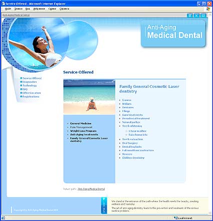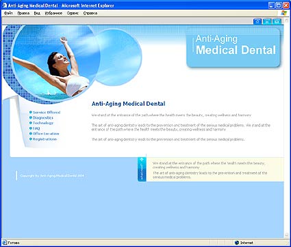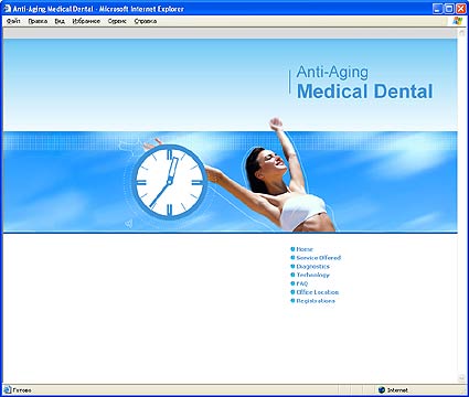 Сайт для частной клиникиСайт разработан для частной клиники Medical Dental. Клиника занимается омоложением и оздоровлением организма человека. В арсенале клиники более ста услуг. Также клиника предоставляет стоматологические и косметологические услуги. Сплеш скрин. | На сайте можно получить детальную информацию о предоставляемых услугах и технологиях. Узнать ответы на наиболее часто задаваемые вопросы и контактную информацию. Главная страница. | Для озвучивания флеш ролика на сплеш странице сотрудникам компании пришлось поработать диджеями и применить свои вокальные данные. Страница второго уровня. | |