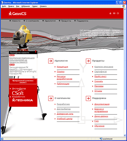 Сайт продуктов GeoniCS компании "ГЕОНИКА"Компания Information Technology Services™ разработала сайт для НПЦ «ГЕОНИКА» - производителя технологической линии продуктов GeoniCS. Сайт посвящен проблематике создания и развития отечественной технологической линии GeoniCS, основанной на платформе AutoCAD. Продукт предназначен для обработки данных изысканий и геоинженерного проектирования в области гражданского, промышленного и транспортного строительства. Сайт технологической линии GeoniCS стал первым сайтом, разработанным и оснащенным системой управления контентом WEBXT Site На сайте можно найти краткое описание продуктов, скачать документацию, примеры, сам программный комплекс, состоящий из трех продуктов, ознакомиться с отзывами и посмотреть примеры, демо-ролики, и многое другое. Также здесь можно узнать о ценах на продукты GeoniCS, о системе скидок, обновлениях и обучении. Первая страница сайта как бы приглашает посетителя взглянуть в нивелир и произвести измерения.