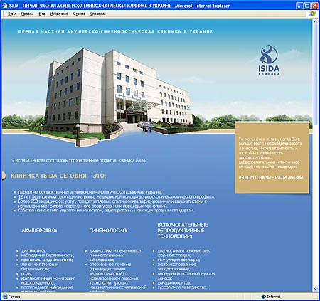Сайт - новость для частной клиники ISIDA9 июля 2004 года в г. Киеве состоялось торжественное открытие клиники ИСИДА. Клиника ИСИДА первая негосударственная акушерско-гинекологическая клиника в Украине. Более 250 медицинских услуг, предоставляемых опытными квалифицированными специалистами с использованием самого современного оборудования и передовых технологий, 12 лет безупречной репутации на рынке медицинской помощи акушерско-гинекологического профиля выгодно отличают клинику от подобных ей клиник и государственных учереждений. К торжественному моменту открытия клиники компания Information Technology Services разработала страничку – новость на которой посетитель сможет вкратце ознакомиться с основными направлениями деятельности клиники, режимом работы и схемой проезда. |