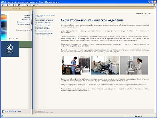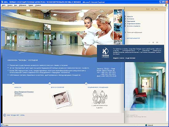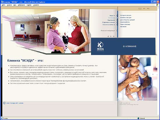 Сайт для клиники ИСИДА ИСИДА - первая негосударственная акушерско-гинекологическая клиника в Украине. Сайт содержит полную информацию о клинике ИСИДА. На нем можно получить исчерпывающую информацию более чем о 250 видах медицинских услуг, предоставляемых в клинике, а также о высочайшем уровне сервиса. Главная страница. | В разделе «Наши врачи» размещена подробная информация о врачах клиники. Также, на сайте можно узнать режим приема клиники, схему проезда и т.д. В разделе «Полезная информация» будущие родители смогут узнать адреса магазинов для будущих мам, тренажерных залов , косметических салонов и много другой нужной информации. Одна из страниц второго уровня. | Одна из страниц раздела "Отделения клиники". | Специально для сайта были сделаны сотни фотографий интерьеров. После посещения сайта создается прекрасное впечатление о клинике, как о элитном медицинском центре с прекрасными интерьерами, высоким уровнем сервиса и доброжелательным персоналом. Сайт отличается обилием красивых фотографий и просторностью. |