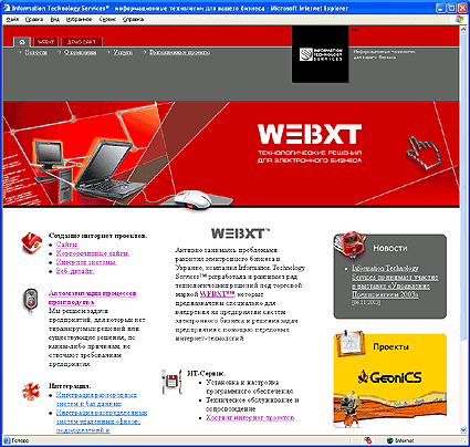 Cайт Information Technology Services Эволюция сайтостроения. | 1997 г. Полностью статический сайт. | 1999 г. Первые попытки создания динамического контента. | 2001 г. Сайт оснащен ситемой управления контентом WEBXT, весь контент сайта динамический. | | 2003 г. Сайт создан на основе технологических решений WEBXT - лучшее решение для создания интернет проектов. | В новой версии изменилось практически все: дизайн, интерфейс да и просто подход. Основные отличия нового дизайна: максимальная простота, лаконичность, понятность и удобство. Страницы стали просторнее и светлее, «шапка» с логотипом теперь соответствует стилю наших визиток, бланков, презентаций. Многие разделы переехали на новое место, а некоторые были удалены совсем, так как повторялись на сайте в нескольких местах, зато появились новые. Теперь вы сможете более подробно прочитать о наших проектах, посмотреть более крупные скриншоты. Изменилось меню. Оно стало намного проще и понятнее. Удален быстрый переход – теперь он вам не понадобится. Страница поиска для совмещена с картой сайта. Сайт стал «резиновым», тоесть растягивается на полный экран. Что осталось неизменным, так это технологические решения WEBXT. Новый сайт, как и старый создан при их помощи. Используются следующие модули: - «Новости»;
