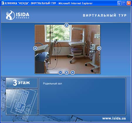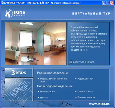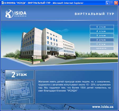 Виртуальный тур по зданию клиники ИСИДА ИСИДА - первая негосударственная акушерско-гинекологическая клиника в Украине, открывшая свои двери для посетителей 9 июля 2004 года в г. Киеве. Внешний вид клиники.Выбор этажа. | На 8300 м2 и 6 этажах современного здания разместились отделения вспомогательных репродуктивных технологий, женская консультация, акушерское и гинекологическое отделения и многое другое. Выбор помещения . | Посетитель сразу видит, какие отделения и помещения находятся на конкретном этаже. Он может посетить палаты, оценив их уют по достоинству, родильные залы и современые операционные – гордость клиники. Также посетителю доступны панорамы холлов и кабинетов в формате QuickTime VR. Просмотр помещения в формате QuickTime VR. | |