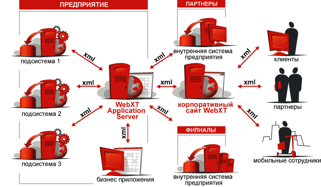 Интеграция разнородных систем и баз данныхАвтоматизировав работу отдельных подразделений, предприятие может столкнуться с проблемой объединения систем подразделений в единую информационную систему предприятия. Автоматизированные в разный период времени подразделения могут использовать различные прикладные системы, базы данных, работающие на различных аппаратно-программных платформах, что может сказываться на эффективности работы предприятия в целом. Технологические решения WEBXT позволяют создать на основе существующих подсистем предприятия единую информационную систему, которая обеспечит оперативное взаимодействие и обмен информацией между различными системами учета, прикладными системами, базами данных, а также обеспечат эффективное взаимодействие с предприятиями партерами и удаленными филиалами. Использование решений WEBXT позволит работникам предприятия получить оперативный доступ ко всем информационным ресурсам предприятия из различных систем учета, баз данных различных подразделений либо удаленных офисов. Созданная, на основе решений WEBXT, система обеспечит электронный обмен данными между подразделениями, офисами и партерами предприятия, обеспечит контроль выполнения бизнес процессов, а также позволит расширить возможности уже существующих подсистем предприятия.