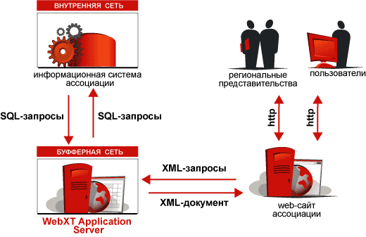 | 2. | WEBXT Application Server | Обеспечивает обработку запросов пользователей | Получает XML- запросы от WEB-сайта Ассоциации, выполняет их обработку, непосредственно исполняет запросы к базе данных информационной системы Ассоциации, формирует XML-документы результатов запросов и передает их на WEB-сайт Ассоциации |